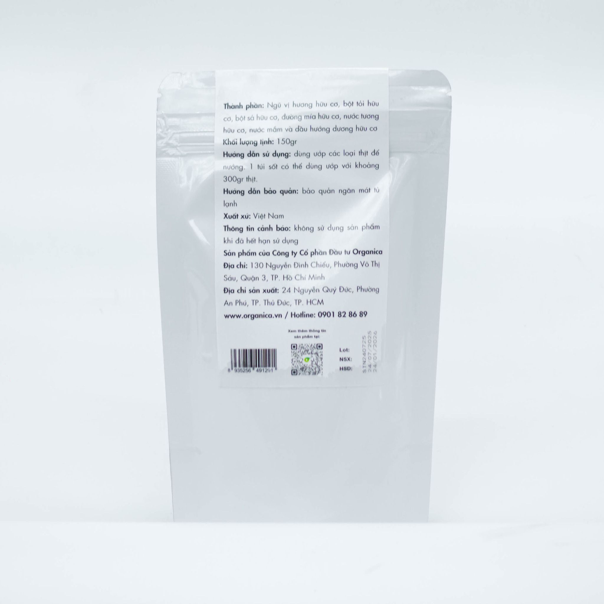 Ngũ vị hương hữu cơ, bột tỏi hữu cơ, bột sả hữu cơ, đường mía hữu cơ, nước tương hữu cơ, nước mắm và dầu hướng dương hữu cơ.Khối lượng tịnh: